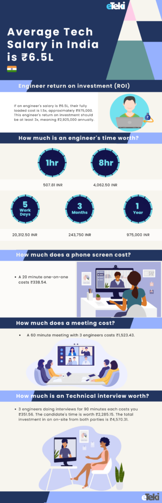 We have calculated the average tech salary costs in the US($150K), India(₹6.5L) and Globally(€78K) salaries respectively through the engineerworth web tool. However, depending on their experience and location it can be much higher or lower than this number suggests.